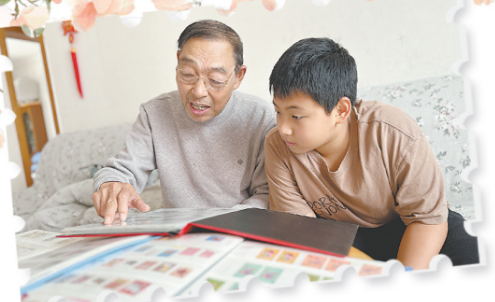 上圖 張同意(左)和外孫一起欣賞自己收藏的郵票。