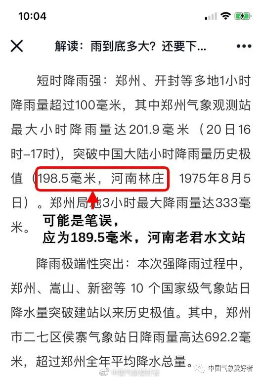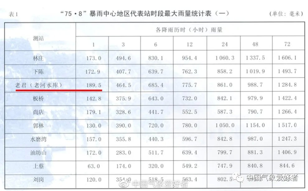然而,陶詩(shī)言院士《中國(guó)之暴雨》、丁一匯院士《論河南758特大暴雨的研究:回顧與評(píng)述》中,均指出758暴雨的最大1小時(shí)雨強(qiáng)為189.5毫米;民政部和國(guó)家統(tǒng)計(jì)局的《中國(guó)災(zāi)情報(bào)告》和河南水利廳的《河南758特大洪水災(zāi)害》中,也指出,758暴雨的最大1小時(shí)雨強(qiáng)為189.5毫米,發(fā)生在老君水文站。
