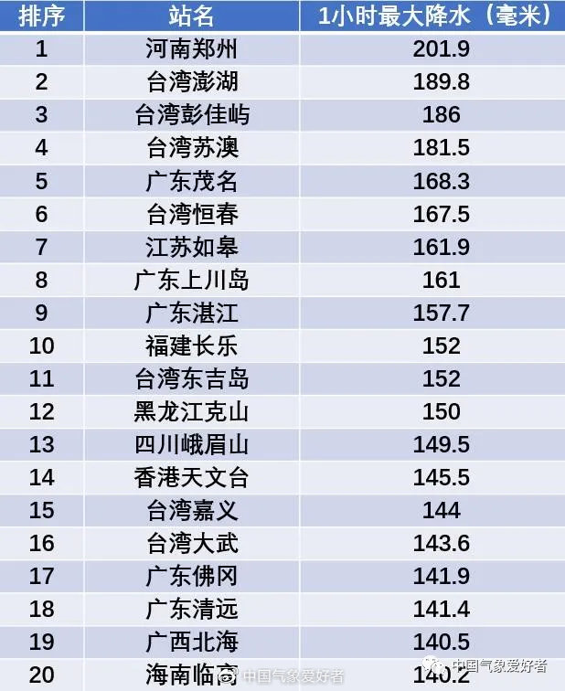 正因?yàn)榇,鄭州?01.9毫米,在我國(guó)大陸的國(guó)家級(jí)氣象站數(shù)據(jù)中一騎絕塵,遠(yuǎn)遠(yuǎn)甩開廣東的一眾站點(diǎn);甚至于超過了極端暴雨頻發(fā)的臺(tái)灣,位居全國(guó)國(guó)家級(jí)氣象站第一。當(dāng)然,以60分鐘滑動(dòng)數(shù)據(jù)計(jì)算,澎湖比鄭州稍高一些,但除此之外臺(tái)灣竟然也找不出第二個(gè)比鄭州更大的站點(diǎn)。