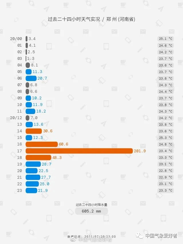 在精密的現(xiàn)代氣象監(jiān)測(cè)系統(tǒng)下,720暴雨的數(shù)據(jù)沒有什么疑問,那就是1小時(shí)最大201.9毫米,60分鐘滑動(dòng)最大202.2毫米,是我國(guó)大陸短時(shí)強(qiáng)降水標(biāo)準(zhǔn)的10倍,暴雨紅色預(yù)警標(biāo)準(zhǔn)的近7倍,香港天文臺(tái)最高等級(jí)預(yù)警“黑色暴雨警告”標(biāo)準(zhǔn)的近3倍,這一小時(shí)的雨量,打破了鄭州之前的24小時(shí)雨量紀(jì)錄。